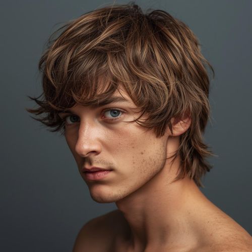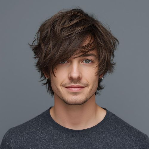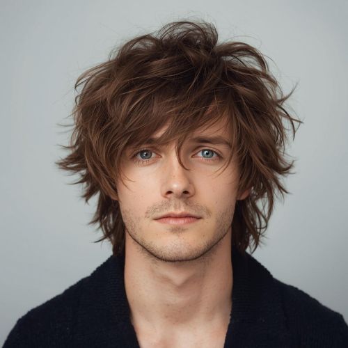 A shag haircut for men features choppy, uneven layers throughout. This style creates texture, volume, and natural movement.