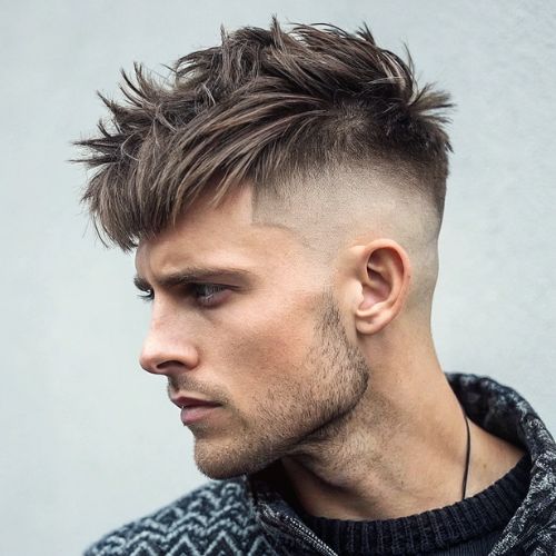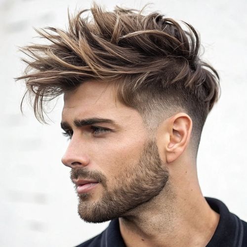 The faded sides add clean definition and modern edge. This style delivers attitude with easy maintenance. It works great for those who want standout style. Use light product to enhance the messy texture.
