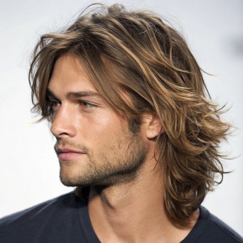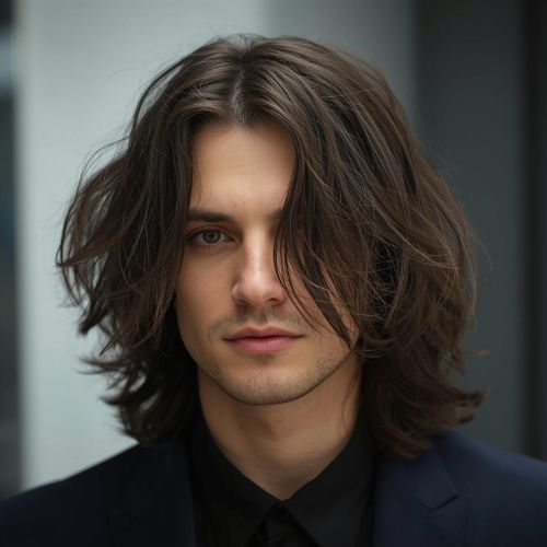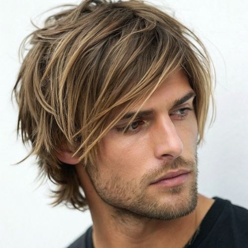Long shaggy hairstyle gives men a free, creative feel with soft layers and messy texture. The longer hair needs light layers to move naturally and look cool, not forced.