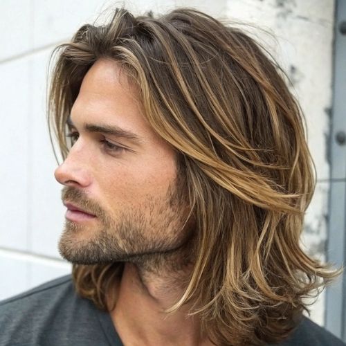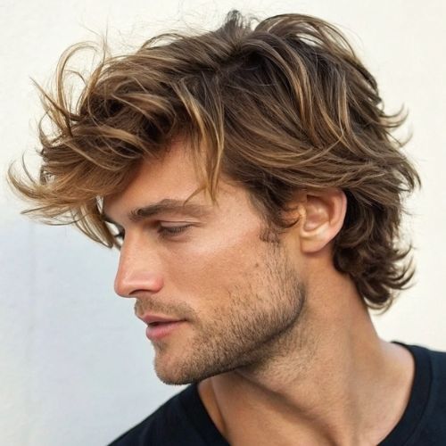 Layered shaggy hairstyle brings fun, relaxed energy for men. Soft layers and messy texture create a cool, easy look. This style works with short, medium, or longer hair.