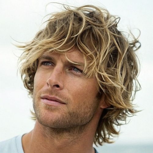 Shaggy surfer haircut captures beach vibes perfectly. This cut has messy, sun-kissed layers throughout. Hair falls naturally with carefree movement.