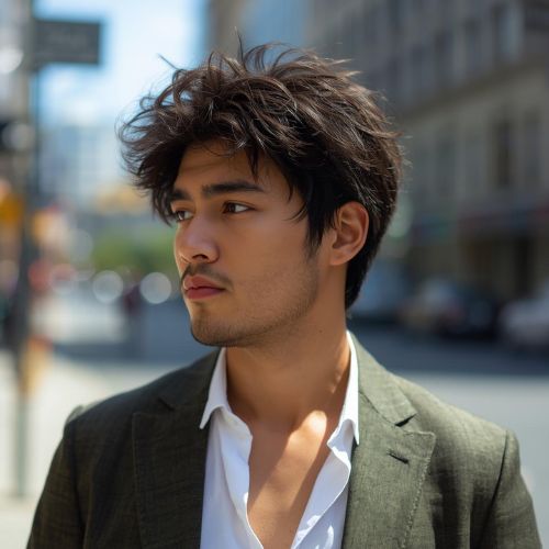 Textured shaggy haircut gives men a fun, relaxed vibe. The messy texture and soft layers create a cool look. This style feels easy and never forced. It works with short, medium, or longer hair.