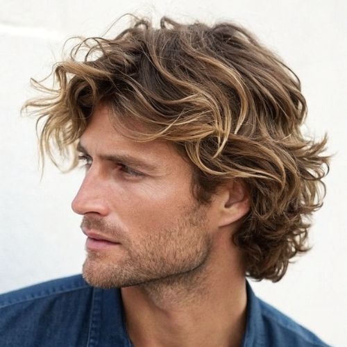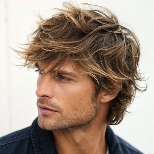 Classic shaggy hair gives men a cool, relaxed feel. Soft layers and messy texture make it fun and easy. This style works with short, medium, or longer hair.