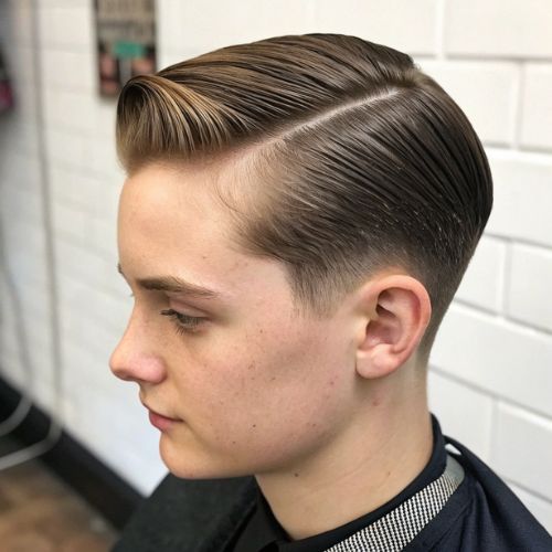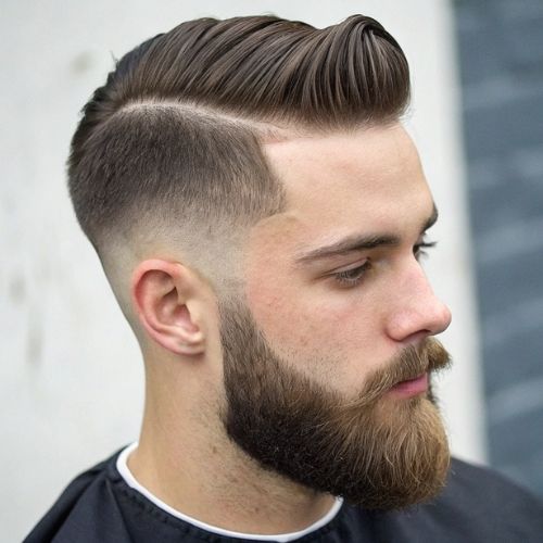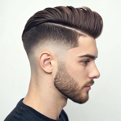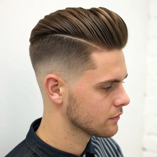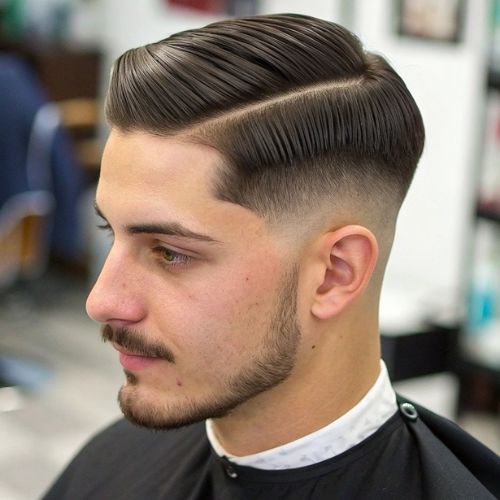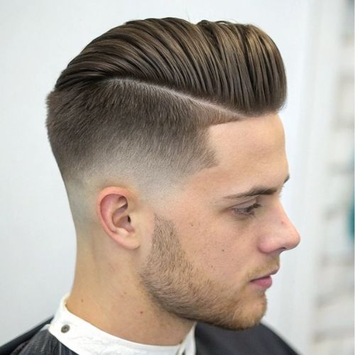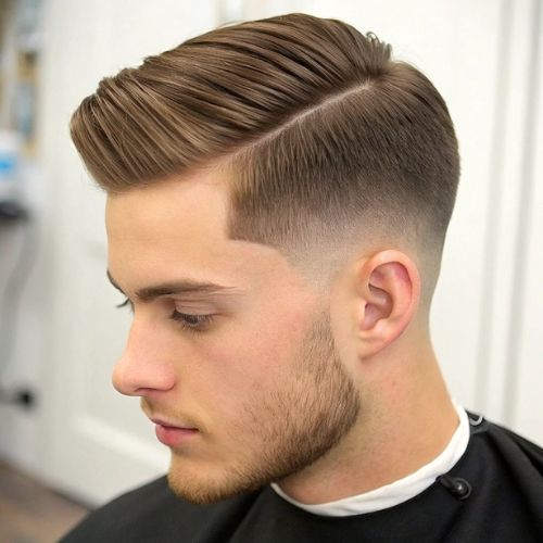 This haircut sweeps hair to one side with sides that fade smoothly. It gives you a sophisticated style that works perfect for any setting.