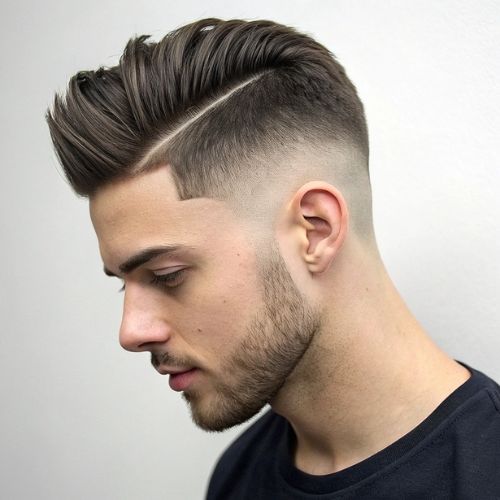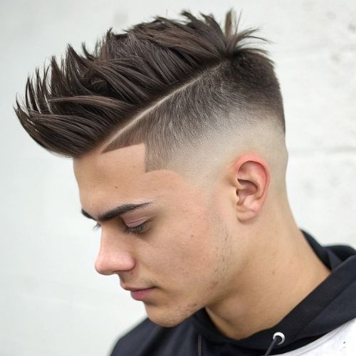 This haircut has a bold center strip with a carved side part and sides that fade high. It gives you a modern, eye-catching look that shows confidence.