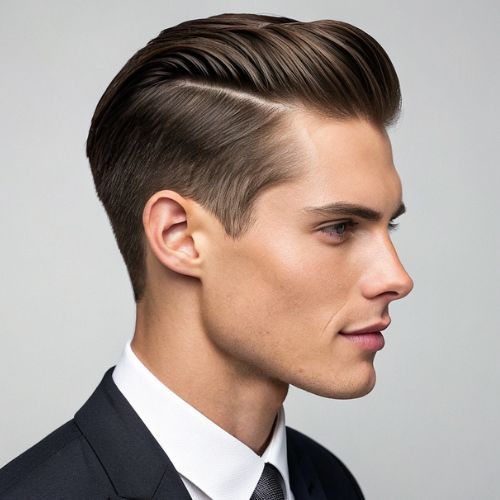 This haircut keeps your hair neat with a clean side part that sweeps to one side. It gives you an elegant style for any setting.