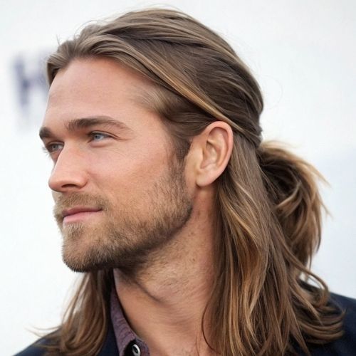 The long flowing side part brings elegance and movement to your look. This haircut has longer hair swept to one side with shorter sides.