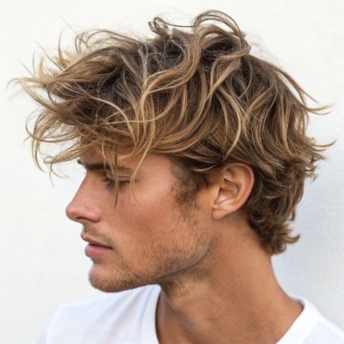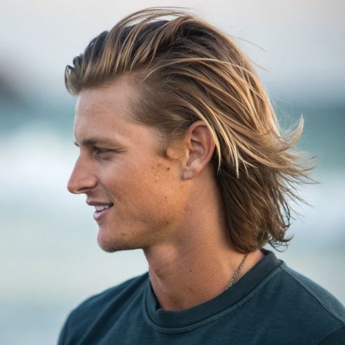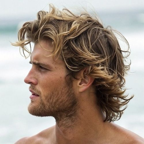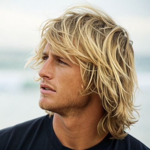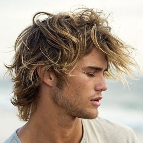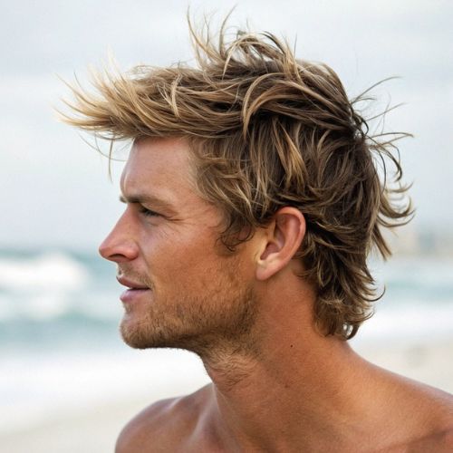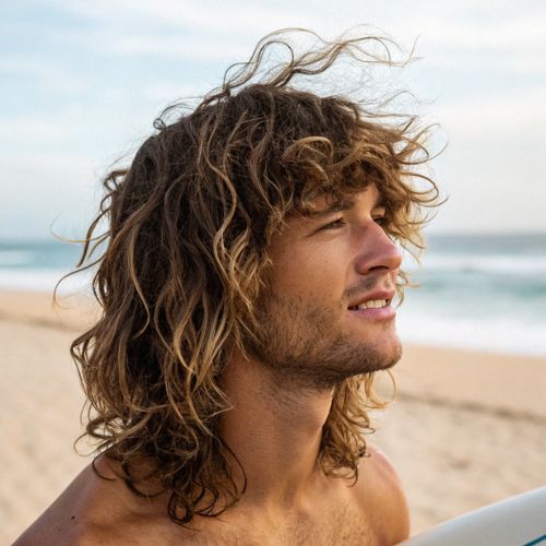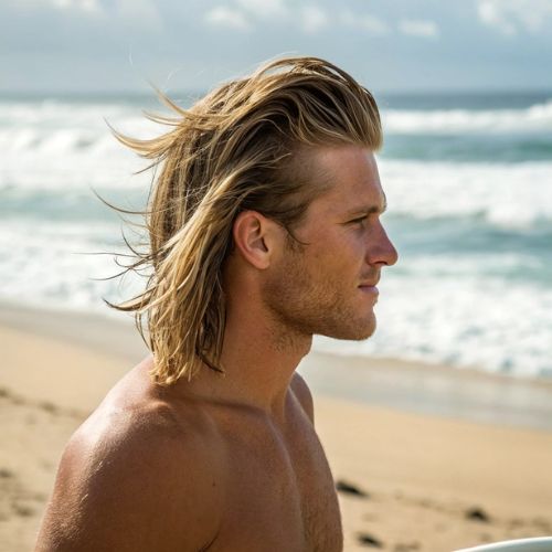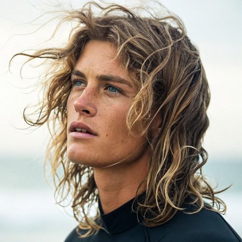 The surfer haircut shows beach style with messy, medium-to-long hair that looks textured from ocean water. This style has sun-bleached streaks, salt-boosted waves, and an easy messy finish.