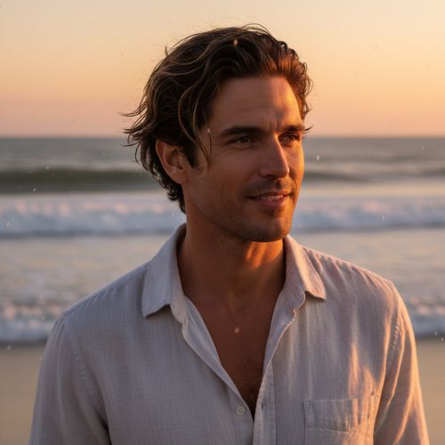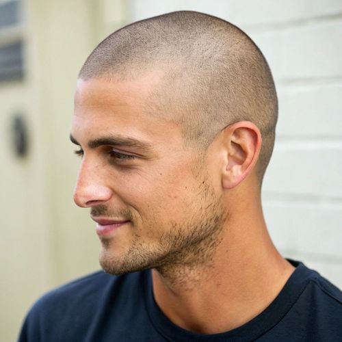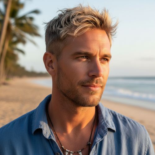 Ultra-short hair all around. Easy, cool, fun, and free. Perfect ocean style from the sea. Relaxed and simple. Fresh with natural appeal. Sunny day beach energy. Soft stubble.