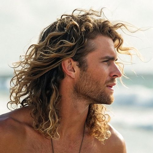 Long, curly surfer hair has sun-kissed spirals with natural highlights. The wild style shows beach freedom. Its salt-textured look is carefree.