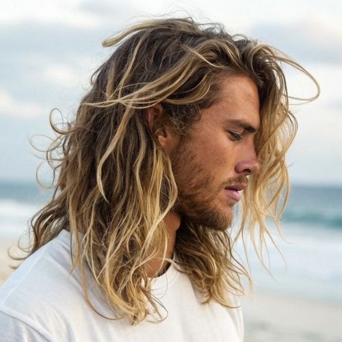 The surfer hairstyle gives you that cool look from a sunny day at the beach. It has messy waves, soft layers, and natural flow like you just came from the ocean.