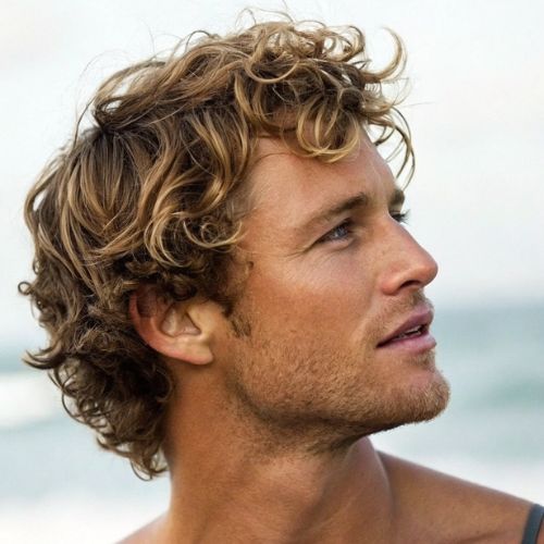 Short curly surfer hair has tight, bouncy coils with sun-lightened ends. The ocean adds texture. This style offers easy volume and movement.