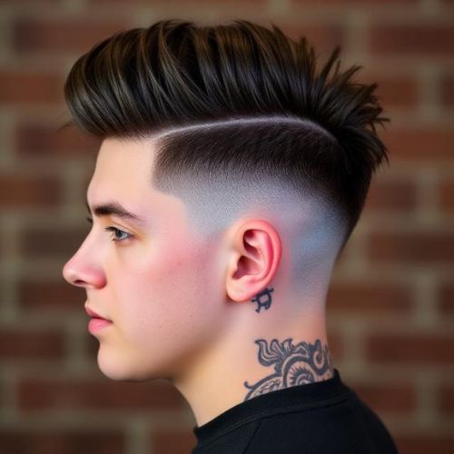Bold, sharp, and impossible to ignore. The high fade cuts close near the temple and rises fast, creating a dramatic contrast that makes the top stand out hard.