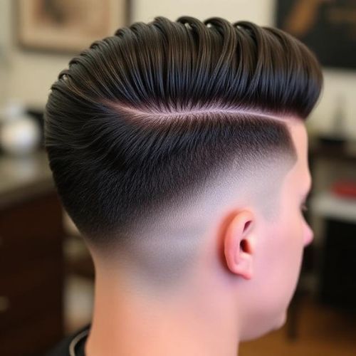 - Textured pompadour on top adds height and body without heavy product.